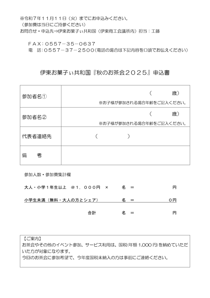 以下の申込書に必要事項を記入し伊東商工会議所への持参、FAXまたは電話での受付となります。